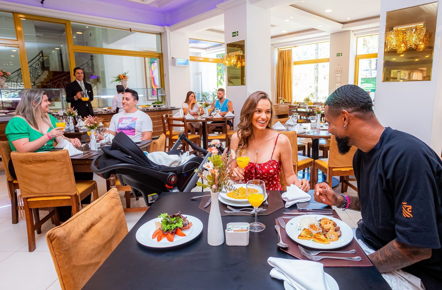 Onde são servidas as principais refeições do dia, café da manhã, almoço e jantar, você vai se encantar com a nossa gastronomia e com nosso serviço completo de bebidas. A elegância do ambiente do nosso restaurante, também é outro diferencial. Aqui o hóspede encontra deliciosos sabores, com apresentações de pratos da culinária nacional e internacional. O restaurante é em formato de buffet e está aberto no café da manhã, das 7h às 10h; no almoço, das 12h30 às 15h e no jantar, das 19h30 às 22h. Afinal nada melhor que viajar e comer bem!